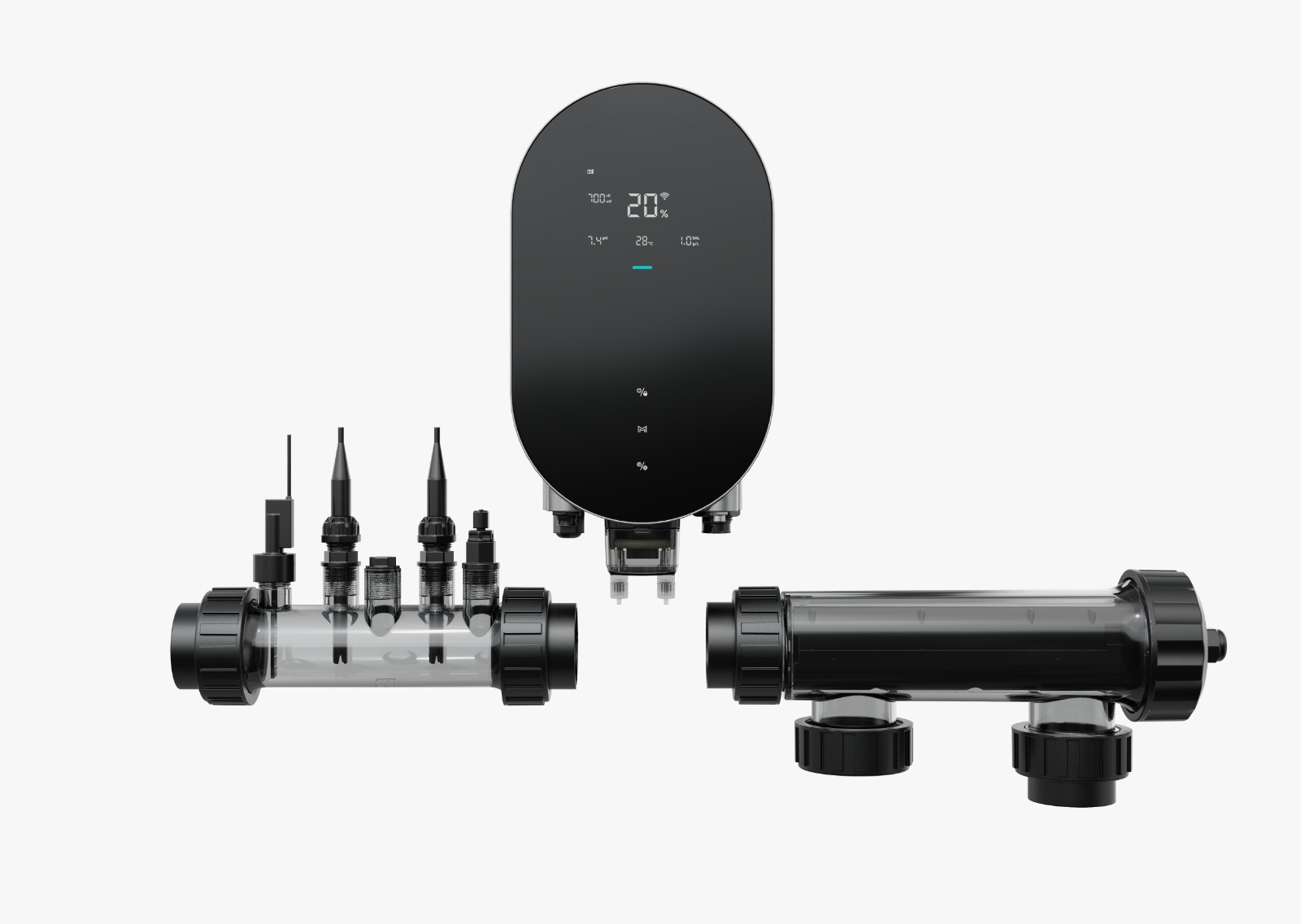 The sleek touch-screen controller features a built-in peristaltic pump for precise pH dosing. For comprehensive water quality monitoring and easy installation, the system includes integrated pH and temperature probes, an ORP probe, and a flow switch, all conveniently housed within the salt cell.